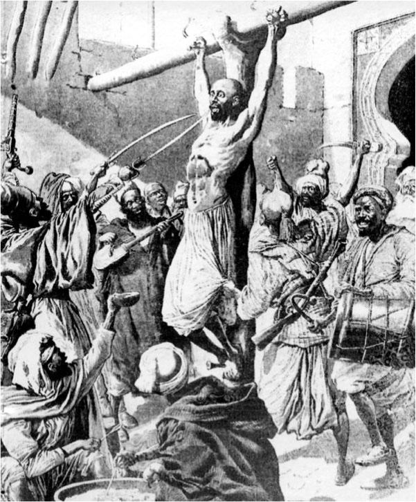 Распятие каида Хабура в 1892 году в Марракеше. Казнь прошла под музыку, после чего начались торжества. Иллюстрация из «Пти журналь». Частн. кол.