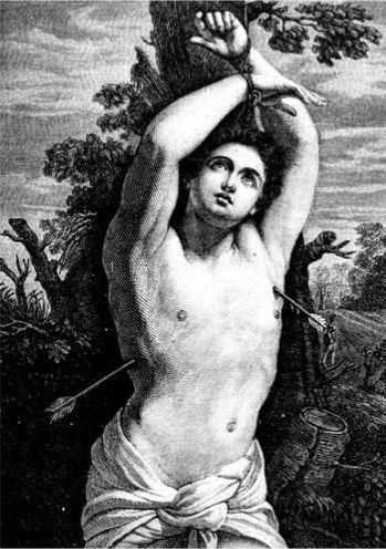 Казнь Себастьяна, преторианца личной охраны императора Диоклетиана, стала одной из излюбленных тем средневекового христианского искусства, что послужило пропаганде данного вида казни, редко использовавшегося на Западе. Себастьян избрал военную карьеру, отличился отвагой и вскоре стал одним из фаворитов Диоклетиана, который назначил его капитаном первой роты своей гвардии. Себастьян был тайным христианином, сумел обратить римского префекта Хроматия, а с ним и более полутора тысяч рабов. Себастьяна арестовали по приказу императора, привязали к столбу, изрешетили стрелами и оставили умирать. Христианка по имени Ирина пришла ночью, чтобы забрать тело, но увидела, что Себастьян еще жив, и вылечила его с помощью умелых врачей. Чудом исцелившийся Себастьян встал однажды на пути императора и упрекнул его в жестокости по отношению к христианам. Диоклетиан растерялся: «Не ты ли тот Себастьян, командир когорты, которого я приказал недавно пронзить стрелами?» – «Это я, мой господин, – ответил Себастьян, – и Бог даровал мне жизнь, чтобы обвинить тебя в злодеяниях». Диоклетиан приказал арестовать Себастьяна, забить палками до смерти и выкинуть тело в один из римских каналов для сброса нечистот.