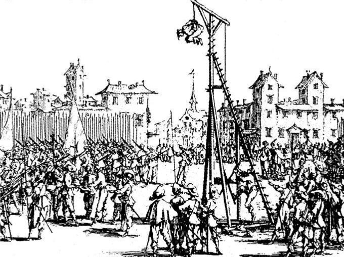 Дыба для солдат-дезертиров. Гравюра Жака Калло. Частн. кол.