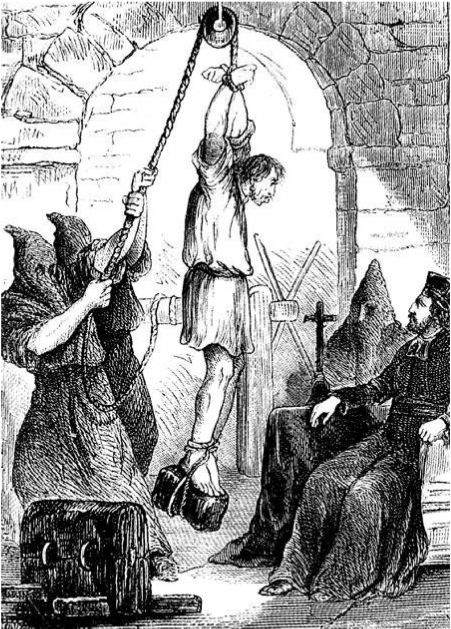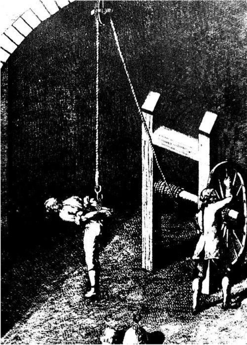 Иногда пытка носила более изощренный характер, превращаясь в сущий ад. Например, к ногам жертвы привязывали груз весом от шестидесяти до ста двадцати килограммов, чтобы рывок был резче. В таком случае страдали не только руки, но и ноги, ломались кости, нередко лопался живот и внутренности вываливались наружу.