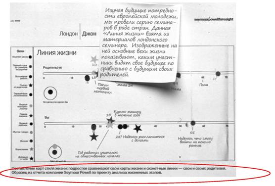 Это визуальный и текстовый дневник их жизни. Его нужно создавать по пяти линиям или параллельным этапам. Это – в прямом смысле линии, вдоль которых располагаются изображения; они проведены по стенду/стене тренда или карте потребителя слева направо, от той группы изображений, клейких бумажек или записок, которые представляют человека в целом (вещи, которые его определяют, делают его уникальным), к группе, которая символизирует то, каким он желает стать: изображения, записки, размыш–ления, небрежные замечания, которые обычно собирают сами потребители, ведя постоянный «дневник мечты» или личный дневник.