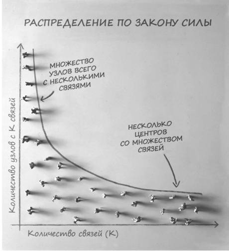 Изучая сети, именно это заметил и Барабаши со своей командой: большинство действий в сети приходилось на маленькую, но мощную группу центров. Они назвали ее «центрами силы». Этот вид деятель–ности осуществляется в соответствии с законом силы, который по возрастающей демонстрирует тот факт, что в большинстве реальных сетей «у большинства узлов есть всего несколько связей, – объясняет Барабаши, – и что эти крошечные узлы сосуществуют с несколькими большими центрами – узлами с аномально высоким количеством свя–зей». «Тех немногих связей, которые соединяют меньшие узлы с более крупными, недостаточно, чтобы сеть была полностью связана. Эту функ–цию выполняют несколько относительно редких центров, которые не дают реальным сетям развалиться». Это – люди, благодаря которым клубы, организации или тренды существуют как единое целое, а также образуются связи с другими людьми и другими областями культуры.