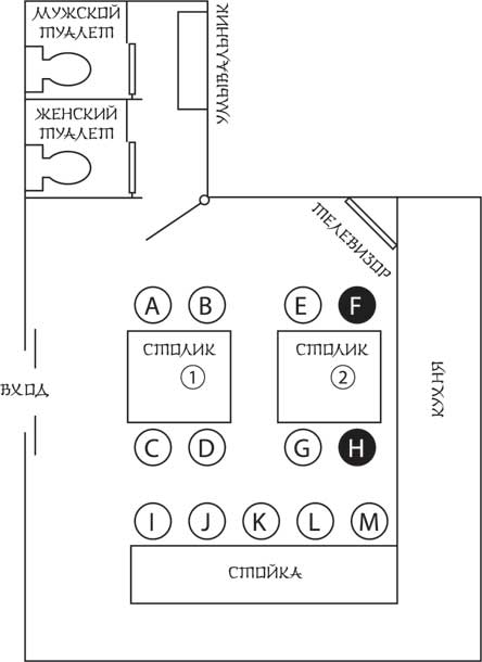 – Верно. Слева, то есть с западной стороны, за Столиком 1 обозначены буквами от «А» до «D» четверо: двое мужчин и две женщины, видимо, заглянувшие туда по пути с работы. А за Столиком 2 с восточной стороны сидела обозначенная буквами от «E» до «H» компания из четырех членов театральной труппы, в том числе и я. Помнится, все места у стойки тоже были заняты мужчинами. По сути дела, выходит, зал был полон и в нем бурлило оживление. Поскольку хозяйка управлялась в одиночку, можно представить себе, в какой она была запарке. Пока все ясно?