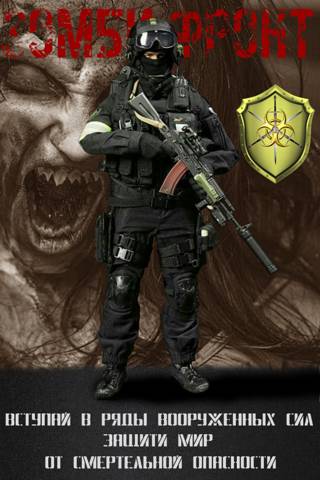 Через минуту Игорь притащил рулон бумаги, встал перед друзьями и держа за края развернул его. Это оказался армейский агитационный плакат. На плакате был изображён солдат в полной экипировке с автоматом в руках. Сверху красным затёртым шрифтом красовалась надпись ЗОМБИ ФРОНТ, а внизу плаката текст в стиле шрифта милитари, гласящий «Вступай в ряды вооружённых сил. Защити мир от смертельной опасности». Справа от воина находилась символика войск сопротивления, щит золотистого цвета с эмблемой биологической опасности по центру и тремя скрещенными за ней мечами. Задним фоном плаката служило увеличенное лицо зомбачки в зверином оскале, символизирующее безжалостную эпидемию.