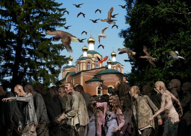 Через час ведения боя всё поле было покрыто серобурозелёными останками бешеных. Зомби остались только на броне, закрыв своими телами всю поверхность. Техника, ослепнув, застыла в поле. Злобно рыкая зомбаки пытались забраться внутрь машин. Командиры приказали стоящим в резерве заградительным БМП попытаться из огнемётов согнать с брони бешеных. Приказ был спорный, выводить с позиций заградительную технику нежелательно, но в сложившийся ситуации другого выхода не было. Резервные БМП двинулись к облепленным заражёнными машинам и подъехав на расстояние выстрела из огнемёта, начали жечь бешеных огнём. Зомбаки, охваченные пламенем, начали покидать броню. Горящими они бросились бежать на оставленные резервом позиции. Следом за ними рванули танки и БМП прикрытия. На позициях началась паника. Люди, лишённые заграждения начали бегать ища укрытия. Через несколько минут в расположение позиций ворвались горящие бешеные. Началась битва с заражёнными чуть ли не в рукопашную. Солдаты пытались отстреливаться, но с малым эффектом, зомбы были почти бессмертны. Бойцы отбивались от них тем, что подворачивалось под руку. В ход шли лопаты, ломы, кувалды, пальцы от траков, рессоры. Некоторые военные всё же успели спрятаться в самоходках, наблюдая из укрытия, как гибнут их товарищи забирающиеся на броню, откуда их стаскивали на землю и заживо пожирали эти монстры. Птицы тоже постоянно атаковали живых. Подоспели боевые машины. Заградительные БМП снова начали поливать бешеных огнём, поджигая и тех бойцов, которые от них отбивались. Страшные крики раздавались вокруг, кричали живые от боли. На них тут же нападали горящие зомби и начинали пожирать. Командир батареи САУ Виталий, сидя в своей установке, в которую людей набилось под завязку, получил приказ начинать движение. Механик с трудом, в страшной тесноте, завёл машину и начал выводить её в поле. В триплекс было видно, как другие арт.установки покидают опорные точки, оставляя дымящихся бешеных поедающих свою добычу. Подоспевшие танки тут же начали утюжить брошенные позиции, давя заражённых и оказавшихся там ещё живых, но изрядно покусанных бойцов. Через десять минут всё было кончено. Остатки птиц, лишившись наземных собратьев, начали кружить на одном месте, образовав в небе воронку и медленно снижаясь. Наконец на землю села последняя птица. Заражённые пернатые раскрыв клювы и вертя головами стояли на месте расправив крылья. Кто-то приоткрыл люк танка (тактический ход) и туда, как по команде бросилась вся стая. Люк закрылся. Птицы расселись на боевой машине в ожидании. Рядом стоящая заградительная БМП долбанула струёй огня по броне танка. Птицы огненными комками посыпались на землю. Взревел мотор, танк начал вертеться на месте уничтожая горящих пернатых. Наконец последняя тварь была раздавлена. Заглох мотор танка. Вся техника застыла. По правилам, тридцать минут ожидания. Полчаса тишины перед тем, как боевые машины начнут движение на запасные позиции. Но снова приказ. – «С места не трогаться».