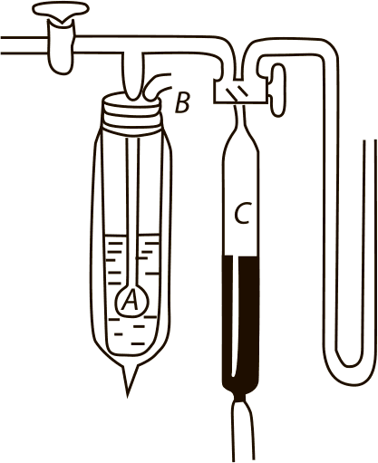 В газометре C находится ртуть, а над нею аргон. Если открыть кран, аргон потечёт по трубке в стеклянный шар A, погружённый в дьюар с жидким воздухом. Трубка B устроена для того, чтобы жидкий воздух, испаряясь и превращаясь в газообразный, свободно уходил в атмосферу. Если бы трубки B не было, то при испарении жидкого воздуха давление в дьюаре возрастало бы непрестанно, и в конце концов дьюар разорвался бы на куски.)