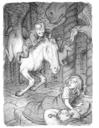 Семья Гриммов мало что могла сделать. Визжа, они по кругу носились по Чертогу Чудес, словно сбежавшие из психиатрической лечебницы. В конце концов появился Зерцало, однако, несмотря на его отчаянные крики и весьма богатый подкуп, мальчишка и его поедающие чили-доги лошади не отступили. Пак преследовал Сабрину, пока та не запуталась в ногах и не упала. Беспомощная, она раскинулась на полу, а пегас пролетал прямо над ней.