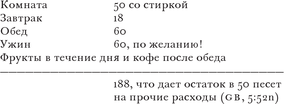 На 100 швейцарских франков прожить, конечно, можно, хотя в этом случае денег не останется почти ни на что, кроме питания и жилья, если поселиться в пансионе. Пансионы здесь, конечно, есть – испанские, за 150 песет (хотя таких предложений мало), если брать комнату внутри дома, выходящую в так называемую вентиляционную шахту. Весной это еще терпимо. Думаю, для тебя будет более практично просто снять комнату, которая стоит 50 песет и при этом вполне комфортабельна. Завтрак тебе будут приносить, обедать можно в приемлемом кошерном ресторане за 2 песеты, что, вероятно, будет дешевле всего и вполне сытно. Продукты для ужина, возможно, ты сможешь покупать сам, что дает следующий бюджет (100 швейцарских франков = 238 песет):