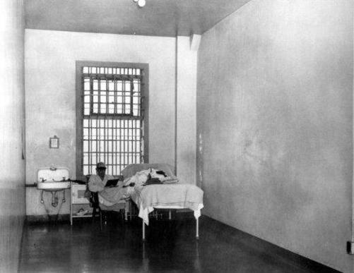 His new cell was spacious, as it had originally been designed as a hospital wardroom to accommodate up to four patients. The room was painted a hospital style green, typical of the 30’s and 40’s. It contained little more than a sink, two beds, a steel utility cabinet for storage and a hard metal-framed chair. For the first eight years there was no toilet, and Stroud was forced to use a bedpan designed for non-ambulatory patients, except on the occasions when he was permitted to leave his cell under escort to use neighboring facilities. The only benefit in these new accommodations was that the room had a window facing the Golden Gate Bridge and it was also the only single-inmate cell with running hot water.