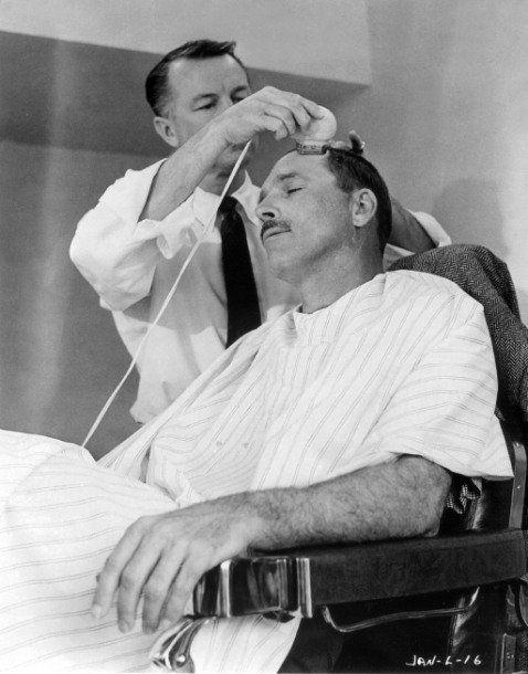 Burt Lancaster having makeup applied during the production of Birdman of Alcatraz.