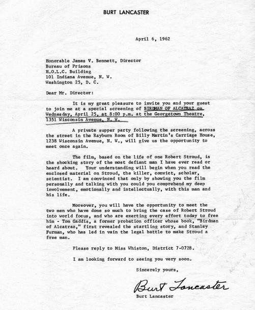 “... I would be delighted to discuss with you the inside details of an incredible epic story. The film, based on the life of the most defiant man I have ever read or heard about. Your understanding will begin when you read the enclosed material on Stroud the killer, convict, scholar, scientist. I am convinced that only by showing you the film personally and talking with you could you comprehend my deep involvement, emotionally and intellectually, with this man and his life.”