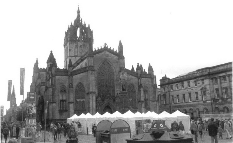 9. Собор Святого Жиля на Королевской миле. Перед собором памятник Дж. Ноксу, на дальнем плане – шпиль церкви Трон