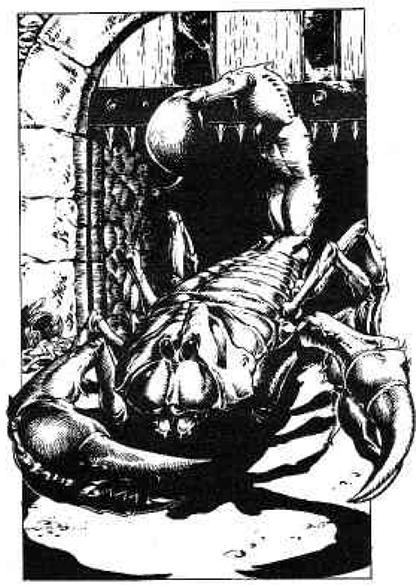 Ты кричишь карлику, что готов к схватке со Скорпионом. Деревянные ворота медленно поднимаются, и из темноты на арену выползает гигантский черный скорпион. Ты выхватываешь меч и готовишься к нападению злобного монстра, вооруженного двумя огромными клешнями и источающим яд жалом.
