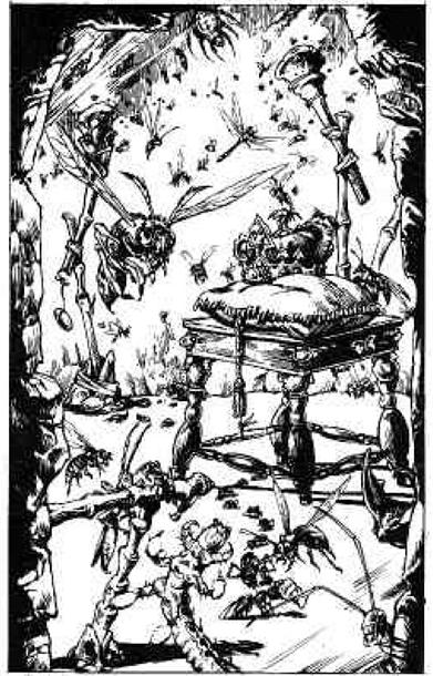 В левую стену туннеля вделана большая стеклянная панель. Сквозь нее ты видишь обширную комнату, залитую светом висящих на стенах факелов. Кажется, что стены комнаты шевелятся от огромного количества облепивших их гигантских насекомых самых разнообразных форм и расцветок. В воздухе, издавая оглушительное жужжание, носятся огромные пчелы, осы, оводы и шершни. В центре комнаты на маленьком столе лежит украшенная драгоценными камнями корона, ее венчает огромный алмаз. Что ты предпримешь?