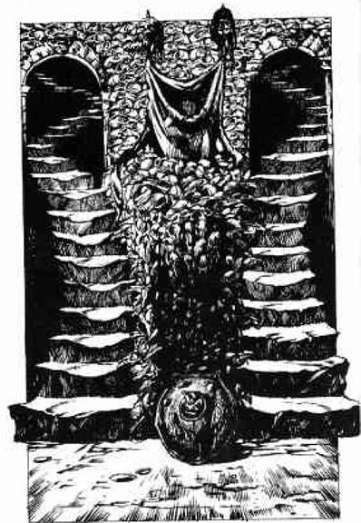 Тебе ничего не остается делать, кроме как, вытащив меч, спуститься вниз по каменным ступеням. Спустившись, ты видишь двух огромных черных сторожевых псов, которые, заливаясь яростным лаем, кидаются на тебя. Сражайся с ними по очереди.