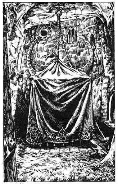 Открыв дверь, ты входишь в небольшую комнату с выстланным соломой полом. В центре комнаты стоит большая, закрытая черным бархатным чехлом, клетка высотой около двух метров. К верхушке чехла привязана веревка, переброшенная через вделанное в потолок медное кольцо; другой ее конец свободно свисает до самой земли. Если хочешь потянуть за веревку и поднять чехол, то 321. Если решишь не трогать его, выйти из комнаты и продолжить свой путь на север, – 316.