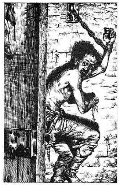 Ты входишь в комнату и видишь одетого в лохмотья человека. Его левая рука прикована к стене, на месте правой – перевязанная грязными тряпками культя. Ты понимаешь, что это его высохшая рука прибита к двери. Моля о спасении, он кидается к тебе, но его рывком останавливает вделанная в стену цепь. Что ты будешь делать? Если решишь освободить человека, перерубив удерживающую его цепь, то 27. Если решишь выйти из комнаты и продолжить свой путь на север, то 78.