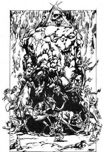 Туннель начинает расширяться. Впереди ты видишь вход в огромную пещеру, из которой доносится гомон многочисленных тонких голосков. Стараясь остаться незамеченным, ты подкрадываешься ко входу и заглядываешь внутрь. Ты видишь множество низеньких длинноухих и длинноносых человечков, танцующих вокруг огромного золотого постамента. Что ты предпримешь?