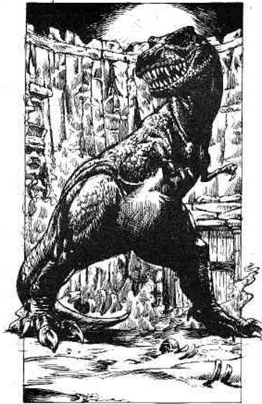 Стена слишком высока, и тебе не остается ничего другого, как открыть прорезанную в ней дверь. Глубоко вздохнув, ты поворачиваешь дверную ручку и оказываешься на дне усыпанной песком расщелины. Прямо перед тобой, загораживая проход к большой двустворчатой двери, которая, судя по всему, является единственным выходом из этой части подземелья, стоит гигантский динозавр. Его толстая шкура испещрена темно-зелеными разводами, поддерживаемое двумя мускулистыми задними ногами массивное туловище возвышается более чем не десять метров. Разевая в реве свою гигантскую пасть, он демонстрирует два ряда устрашающих острых клыков, достаточно мощных, чтобы разорвать на части слона. Понимая, что тебе еще не приходилось встречаться с таким грозным противником, ты вытаскиваешь меч и начинаешь медленно подходить к чудовищному монстру.