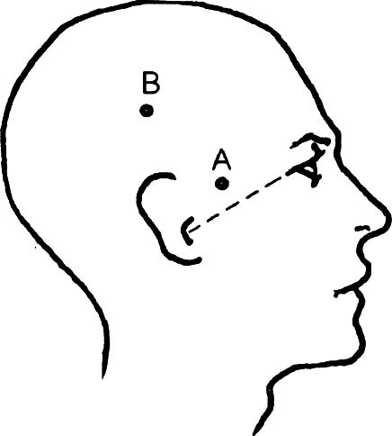 Рис. 17.2. Унилатеральная ЭСТ. Электроды располагаются: А – на 4 см выше средней точки линии, соединяющей отверстие слухового прохода и угол глаза; В – на расстоянии 10 см от точки А над ухом (см.: Crammer, I., Barraclough, В., Heine, В. 1982. The use of drugs in psychiatry. Gaskell, London)