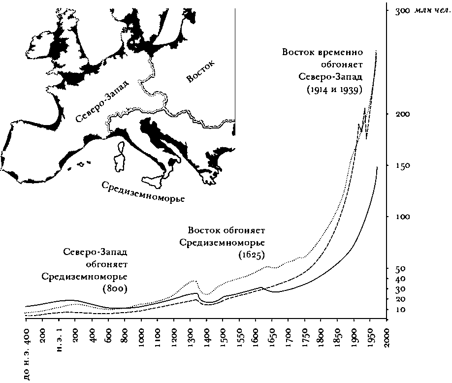 Поэтому начиная с 800 по 1200 г., согласно данным графика, европейские страны обладали более высоким уровнем населения, чем когда-либо прежде. С небольшими отклонениями эти показатели продолжили свое восходящее движение через средневековый и раннесовременный периоды. Это наше первое свидетельство в пользу устойчивости европейской динамики, особенно в северо-западной части континента.