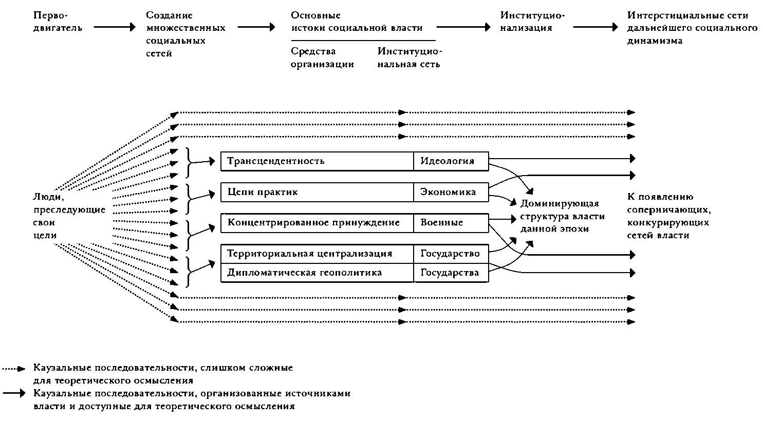 Мы начали с людей, преследующих цели. Под этим я подразумеваю не то, что их цели являются «досоциальными», а то, что характер целей и то, как они создаются, не имеет отношения к тому, что за ними следует. Целеполагающие люди формируют множественность социальных отношений, слишком сложную для любой общей теории. Тем не менее отношения вокруг наиболее мощных организационных средств объединяются в широкие институциональные сети детерминированных стабильных форм, сочетающих в себе интенсивную и экстенсивную, а также авторитарную и диффузную власть. Я предполагаю, что существуют четыре основных источника власти, каждый из которых сосредоточен на различных видах организаций. В свою очередь, необходимость институционализации ведет к их частичному объединению в одну или более доминирующих сетей власти. Эти сети обеспечивают высокую степень ограниченности, которую мы находим в социальной жизни, хотя эти границы и далеки от тотальных. Ряд сетей остаются интерстициальными по отношению и к четырем источникам власти, и к доминирующим организационным конфигурациям; подобным образом некоторые важные аспекты четырех источников власти также остаются слабо институционализированными в доминирующих организационных конфигурациях. Эти два источника интерстициальных взаимодействий в конце концов продуцируют появление более мощных сетей, ориентирующихся на одном или более из четырех источников власти и вызывающих реорганизацию социальной жизни, а также новые доминирующие установки. Так и развивается исторический процесс.