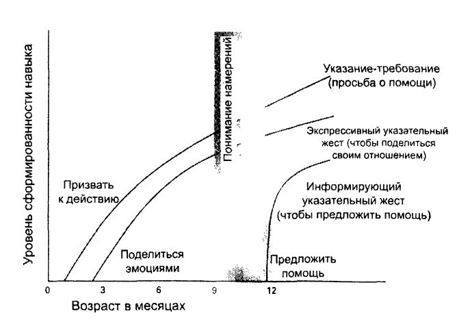 В возрасте примерно одного года дети начинают использовать указательные, изобразительные и конвенциональные жесты, и вскоре после этого они также начинают понимать и использовать речевые конвенции. По-настоящему удивительно, что большинство существующих теорий не предлагают никаких системных гипотез о том, почему освоение речи начинается именно в этом возрасте. По словам Блума (Bloom 2000: 45), «В конечном счете, никло не знает, почему процесс освоения слов начинается примерно в двенадцать месяцев, а не в шесть месяцев или три года». Но это утверждение справедливо только для тех теоретиков, которые рассматривают овладение речью как процесс соотнесения слов с предметами, или, может быть, с понятиями, и при этом не обращают никакого внимания на базовую психологическую структуру совместных намерений (Tomasello 2004). Если бы для того, чтобы выучить слово или иное условное языковое средство, детям надо было бы просто научиться уверенно соотносить конкретный звук с каким-либо опытом («картирование» является типичной метафорой для этого процесса), то младенцы, безусловно, начали бы осваивать речь в шесть месяцев, потому что к этому возрасту они уже в полной мере готовы к такого рода ассоциациям (Haith, Benson 1997). Однако социально-прагматическая теория освоения речи предполагает существование синхронности в развитии жестовой и языковой коммуникации, поскольку ребенок обучается, а затем использует речь и жестикуляцию, опираясь на одно и то же связующее людей звено способности к совместным намерениям. Исследования подтверждают, что это происходит в возрасте примерно от девяти до двенадцати месяцев.
