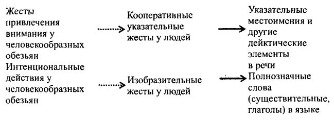 Что касается нашей квазиэволюционной истории, то мы могли бы вернуться к человекообразным обезьянам с их жестами привлечения внимания и интенциональными движениями, потом перейти к людям, которые используют указательные жесты и пантомиму в качестве естественных коммуникативных актов (основанных на новых навыках и стремлении к разделению намерений), и закончить на том этапе, когда люди начинают использовать коммуникативные конвенции, чтобы направить внимание реципиента (указательные местоимения) или заставить его вообразить задуманные коммуникантом референты (полнозначные слова, такие, как существительные, глаголы и их производные).