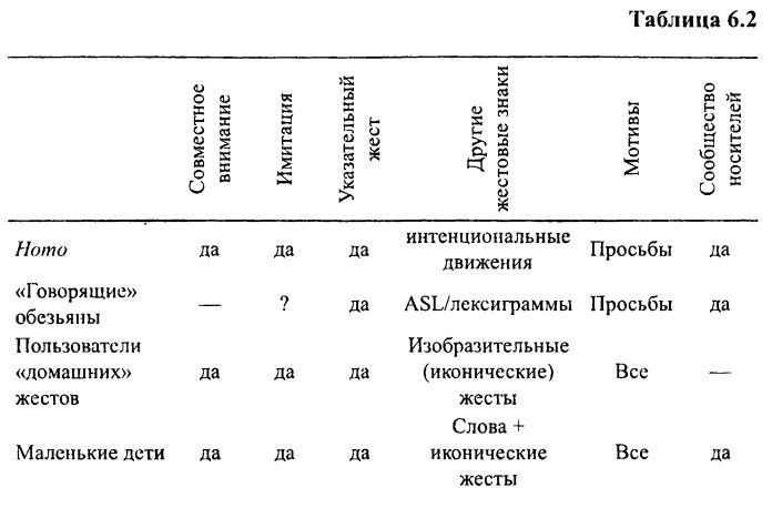 Если говорить об эволюционном развитии, ни одна из ситуаций, разбиравшихся нами выше (кроме естественной коммуникации человекообразных), не характерна для ранних стадий эволюции человека. «Говорящие» обезьяны растут в современных условиях рядом с людьми, а все маленькие дети обладают когнитивными возможностями, которых у древних людей, вероятнее всего, не было, в особенности – навыков воспроизведения смены ролей и навыков совместных намерений. Так что наша модель первых этапов эволюции грамматики должна представлять собой некое сочетание этих различных ситуаций (кратко охарактеризованных в табл. 6.2). Коммуникативные средства, которые наш воображаемый Homo мог бы в то время иметь для того, чтобы произвести это потенциальное сочетание (см. главу 5), – это указательный жест и конвенционализированные интенциональные движения (conventionalized intention-movements), поскольку полноценные иконические жесты предполагают возникновение коммуникативного намерения (см. раздел 5.2.2).