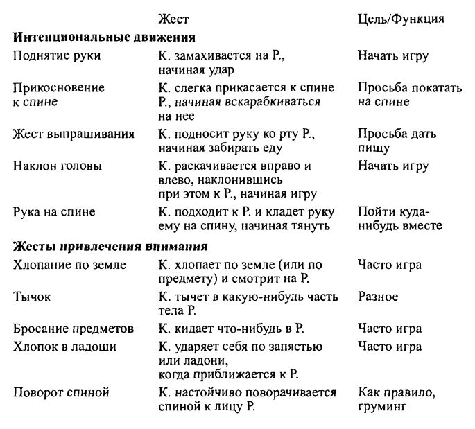 Некоторые целенаправленные жестовые сигналы, которые шимпанзе используют в процессе спонтанного социального взаимодействия в группах (К. = коммуникант, Р. = реципиент). См. Call, Tomasello 2007.