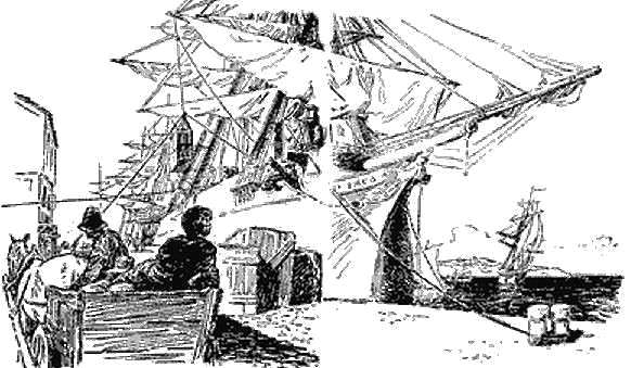Наша тележка остановилась на пристани, и я получил прекрасную возможность увидеть громадные суда, стоявшие вдоль набережной, и полюбоваться их высокими, стройными мачтами и изящной оснасткой.