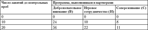 Знакомство с таблицей показывает, что до начала занятий партнеры либо не пользовались у детей никакой симпатией, либо вызывали легкую неприязнь. После 10 проведенных занятий у детей появляется некоторая привязанность ко всем партнерам, особенно заметная по отношению к сверстникам, выполнявшим программу В. Максимальные изменения происходят после 20 проведенных занятий: привязанность к партнерам с программой В достигает максимального уровня, привязанность к партнерам с программой И имеет промежуточную величину, к партнерам с программой С она оказалась минимальной. Статистические тесты и качественный анализ подтвердили высокую надежность установленных различий.