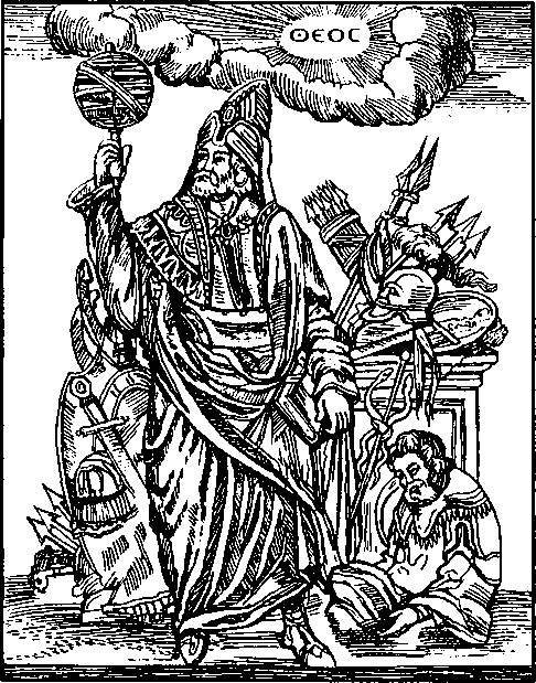 На самых старых, но не таких уж древних портретах Гермес изображен человеком высокого роста, благородной наружности, с бородой, облаченным в ниспадающую свободными складками одежду скорее в греческом, чем в египетском стиле, и в чалме, обернутой вокруг конического шлема в форме митры. Обычно он предстает перед нами в окружении символов собственного культа. Рисунок, приведенный в качестве иллюстрации к данной главе, принадлежит знаменитому автору гравюр к мистическим и теософским трудам Теодору де Бри. Эта гравюра относится к первым годам XVII в. и являет собой одно из лучших изображений Гермеса.