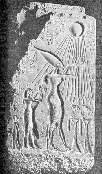 Эхнатон и Нефертити возносят молитвы Атону. Фрагмент росписи стены из известняка. Каирский музей
