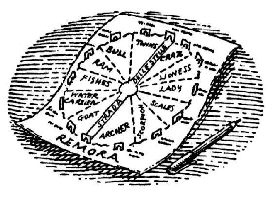 Затем Джорджия начала проводить радиусы, рассекавшие большой круг на отдельные секторы. Она знала, где следует поместить округ Овна и округ Близнецов, и примерно представляла, в каком месте пришлось удирать от Рыб в округ Стрельца. С остальными округами дело выглядело сложнее.