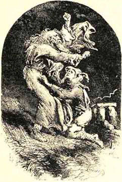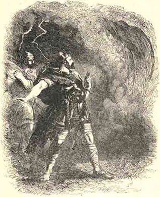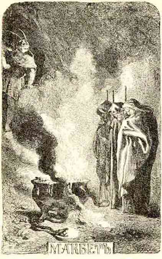 Ведьмы спросили Макбета, от кого он желает получить ответ: от них или непосредственно от старших духов? Макбет, не проявивший ни малейшего страха во время этих отвратительных приготовлений, совершавшихся тут же у него на глазах, смело сказал: «Кто они такие? Покажите мне их!» Тогда перед ним поочередно появились три призрака.