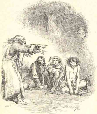 Он нашел их в пещере, где собрались прорицательницы, зная наперёд о приходе короля. Ведьмы были заняты приготовлением страшных чар и заклинали духов, желая узнать будущее. Среди пещеры на огне стоял большой кипящий котел, в который ведьмы бросали жаб, летучих мышей, змей, глаза водяной ящерицы, собачий язык, лапку ящерицы, совиное крыло, чешую дракона, волчий зуб, желудок кровожадной морской акулы, мумию ведьмы, корень ядовитой белены, вырытый в темную ночь, желчь козла, печень змеи с черенком тисового дерева, которое растет на могилах и питается соками разлагающихся тру новь, а также палец мёртвого ребенка.