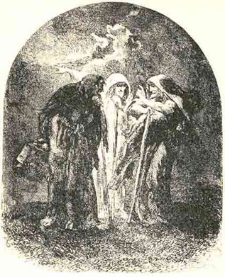 Макбет и Банко, другой шотландский генерал, возвращались вместе с поля битвы. Когда они проходили через пустынную степь, их остановило появление трех странных фигур. Фигуры эти напоминали женщин. Но у каждой из них была борода. Высохшая, сморщенная кожа, дикие движения и странная одежда делали этих женщин совершенно непохожими на земных существ. Макбет первый обратил на них внимание, заговорив с ними. Тогда они, словно обиженные или удивленные обращением человека, поднесли к своим высохшим губам костлявые пальцы в знак молчания. Первая из этих страшных женщин приветствовала Макбета, величая его «гламисским таном». Генерала нисколько не удивило, что странные создания знают его.