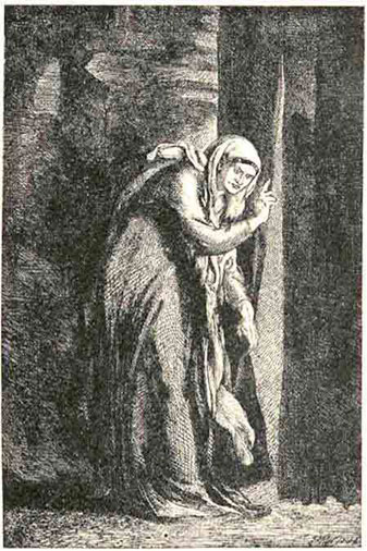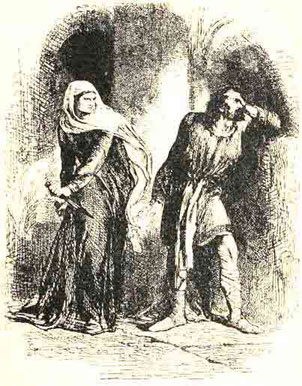Дункан тоже почивал, утомленный путешествием. Леди Макбет вгляделась в лицо спящаго, и вдруг ей представилось, будто в его чертах есть сходство с чертами лица её отца. Рука леди дрогнула, и у нея не хватило присутствия духа совершить злодеяние.