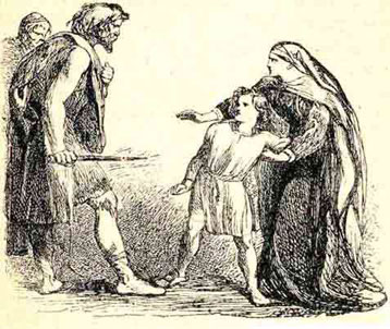 Безумными выходками, а также настойчивыми мольбами они наводили страх на доверчивых людей и собирали милостыню. Теперь в шалаше был один из таких нищих. Но король, погруженный в свое горе, увидев этого полунагого бродягу, решил, что перед ним тоже несчастный отец, отдавший все своим детям и доведенный ими до одиночества, до нищеты. Наученному горьким опытом Лиру казалось, будто ничто не может повергнуть человека в такое несчастье, как неблагодарность детей.