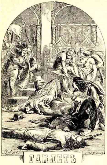 Он попал на похороны молодой и прекрасной Офелии, его возлюбленной. Рассудок молодой девушки помутился после ужасной смерти её отца. То, что отец умер насильственной смертью, да еще от руки принца, которого она любила, так подействовало на нежную душу Офелии, что она потеряла рассудок. С цветами в руках она обходила всех придворных дам, раздавая цветы, говоря, что цветы эти предназначены для похорон её отца.