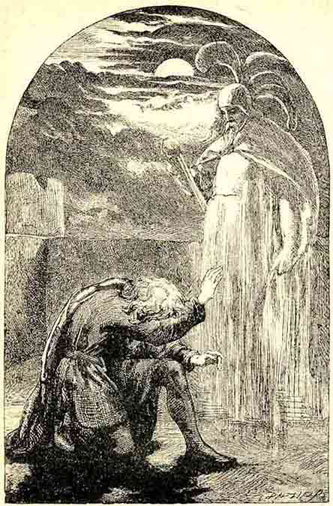 Гамлет сейчас же узнал своего отца: принц начал молиться и просить у Бога защиты, так как не знал, добрый это дух или злой, явился ли он с хорошими побуждениями или губительными? Мало-помалу Гамлет овладел собой и сделался смелее. Ему показалось даже, что отец смотрит на него с глубоким состраданием и будто хочет заговорить с ним. Призрак всем своим обликом до такой степени напоминал Гамлету покойного отца, что принц не удержался и воскликнул: «Гамлет! Король! Отец!» И стал умолять, чтобы призрак сказал ему, почему он покинул могилу, в которую его зарыли на глазах у сына? Зачем ходит по земле, освещенной луною. И что они, живые, могут сделать, чтобы душа умершего успокоилась?..