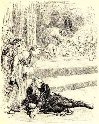 Когда же при дальнейшем ходе пьесы Люциан отравил в саду Гонзаго, то эта сцена до такой степени напомнила королю его преступление, что он не в состоянии был досидеть до конца пьесы. Потребовав поскорее осветить его комнату, он поспешно удалился, сказав, что вдруг почувствовал себя дурно.