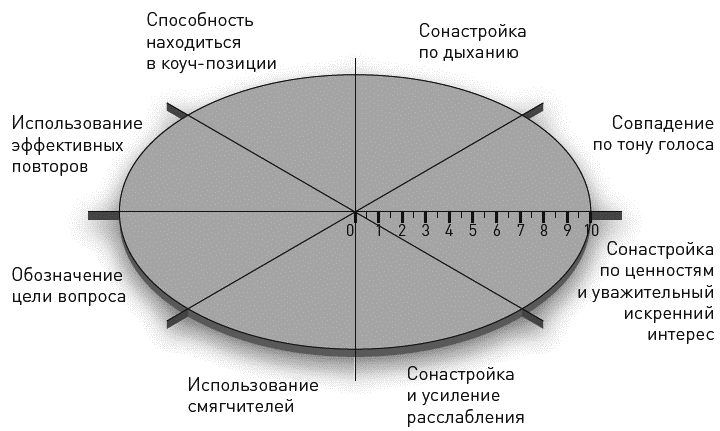 Задача коуча – внутренне выбрать такую позицию, которая позволяет создать большую целостную картину вашего взаимодействия с клиентом, помочь ему снять напряжение и открыться, отвечая на вопросы, касающиеся важных сфер его жизни. Важно уметь расслабиться и самому, так чтобы и собеседник настроился на ваше состояние. С нейтральной обзорной позиции коучу открываются потенциальные ресурсы человека и путь к тому, чтобы увидеть и пробудить в своем собеседнике внутренний гений.