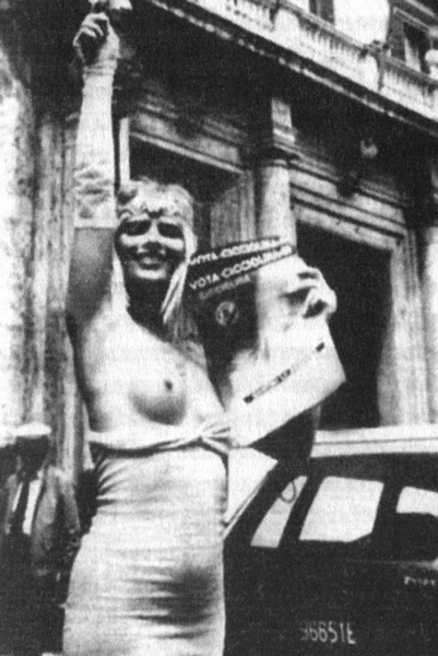 В Европе в семидесятые годы было всего лишь несколько случаев, когда женщины обнажали груди с явно политическими целями. В 1974 году одна француженка появилась с голой грудью перед мэром города Тура в знак протеста против его консервативной политики. Несколько девушек-студенток танцевали с голой грудью вокруг кафедры неназванного «великого немецкого философа» (предположительно это был Хабермас) и заставили его выйти из аудитории, не произнеся ни слова [376]376
