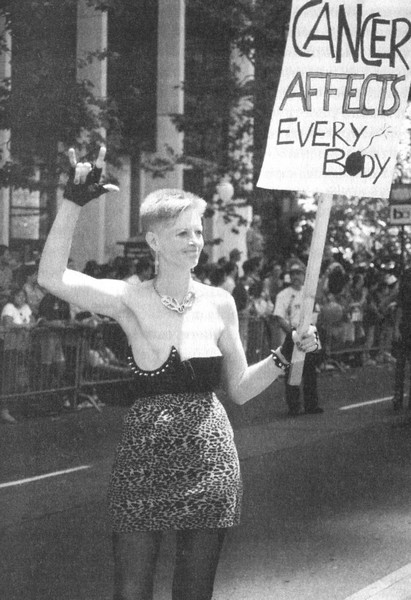 Рак груди объединяет демократов и республиканцев, феминисток и далеких от их взглядов людей, гетеросексуальных женщин и лесбиянок, богатых и бедных. Среди тех, кто посвятил себя этой цели, и феминистки из Коалиции борьбы против рака груди Лонг-Айленда, придерживающиеся консервативных политических взглядов, женщины из Фонда Комена для сбора средств для борьбы с раком груди из Далласа, и лесбиянки, основавшие Центр средств для женщин больных раком в Беркли. Последняя из упомянутых организаций использует ежегодный парад геев и лесбиянок в Сан-Франциско, чтобы привлечь внимание к этому заболеванию. На параде 1994 года Рейвен Лайт, пережившая мастэктомию, прошла по улицам с обнаженной грудью (илл. 90). Она делала это и на других демонстрациях, например, в 1995 году во время демонстрации протеста против строительства электростанции в промышленном районе Сан-Франциско, где число заболевших раком груди и без того было выше, чем в целом по стране.