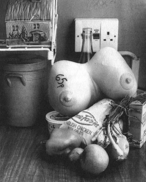 Еще одна фотография Спенс увековечила пару накладных грудей, лежащих на кухонном столе вместе с продуктами (илл. 94). Цена 65 фунтов, написанная на грудях, приравнивает их к упаковке мяса, подобной «Цыплятам с потрохами», рядом с которыми они лежат. Для этого изображения грудей характерна та противоречивость, которой отличаются лучшие работы Спенс, но оно не является прямым нравоучением [404]404
