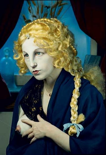 95. Синди Шерман. «Без названия # 225». 1990. Пародируя кормящую Мадонну эпохи Возрождения, Синди Шерман привязывает к себе грудной протез и кладет руку на фальшивую грудь с капельками молока на соске.