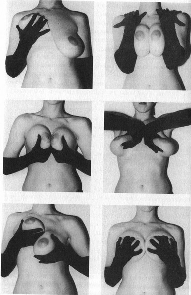 Где-то между искусством и порнографией бывшая проститутка и порнозвезда Анни Спринкл пытается феминизировать фотографию на сексуальном рынке. Работая обнаженной моделью на фотосъемках, она познакомилась с фотографией по обе стороны камеры. Как художник, она создала смешной «Балет грудей», в котором груди имитируют движения классического танца – арабески, глиссады и жете – и опровергают традиционное представление о грудях как о «сферах из слоновой кости» (илл. 96). Спринкл, надев длинные черные перчатки, которые контрастируют с ее белой кожей и красной краской на сосках, поднимала, опускала и двигала груди из стороны в сторону под звуки вальса «Голубой Дунай» для видео 1980 года, а затем для серии перформансов на дискотеках, в художественных галереях и театрах, за которыми последовало широкое распространение «Балета грудей» на постерах и открытках.