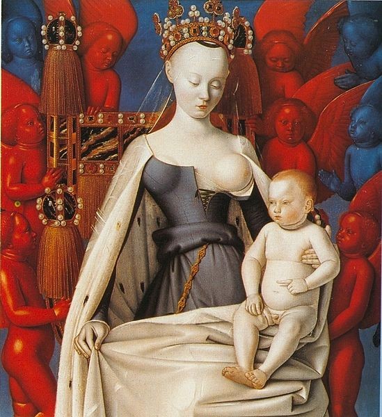 20. Жан Фуке. «Мадонна с младенцем», известная как «Святая Дева из Мелена». Вторая половина XV века. Этот портрет любовницы Карла VII Аньес Сорель, написанной в образе Мадонны, знаменует собой переход от священной груди эпохи Средневековья к эротической груди эпохи Возрождения.